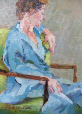 Blue Kimono II is a small oil painting on canvas panel. My inspiration came from the blue hue of the silk kimono worn by one of my favorite models to paint! I also love the contrast of the grass green velvet chair against the draping of the silk robe!